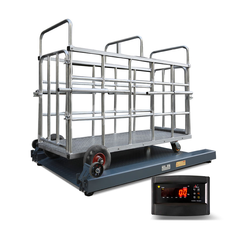 秤體拋丸噴塑工藝處理,防銹防腐耐劃傷。 秤體雙坡道設(shè)計便于推抓豬籠上秤,雙側(cè)帶防跌落臺防止豬籠下滑,底部帶兩個移動輪方便秤體移動。